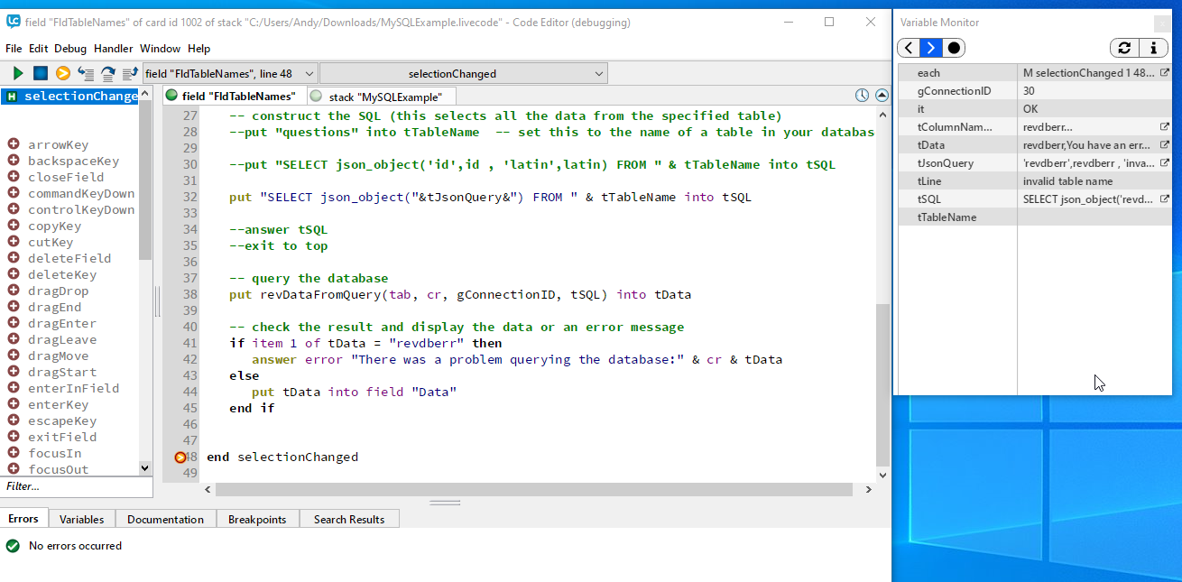 Ridiculously, the list of variables in the debugger is at the bottom of the script editor, so both the script and the list of variables competes for space. The larger I make the list of variables, the less code I can see, and vice-versa. The variables list ought to be listed in a separate pane or window so the programmer can see both the list of variables and the code at the height of the screen. I have a 27" screen but LC forces me to waste it.