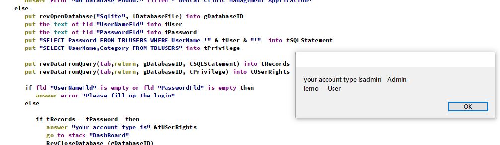 put "SELECT UserName,Category FROM TBLUSERS" into tPrivilege