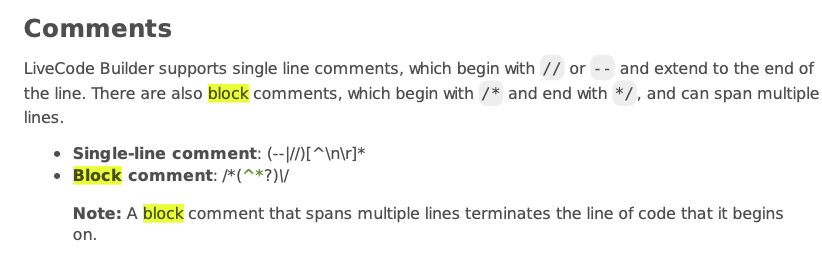 That also might explain why in some of my scripts, the last few lines of a block comment (including the */) are rendered in the various colors as specified by the syntax coloring preferences, while the rest of the comment is rendered in green. It does not explain why the text from /* to */ is, in fact, treated as a comment by the LiveCode interpreter. All those scripts execute correctly.