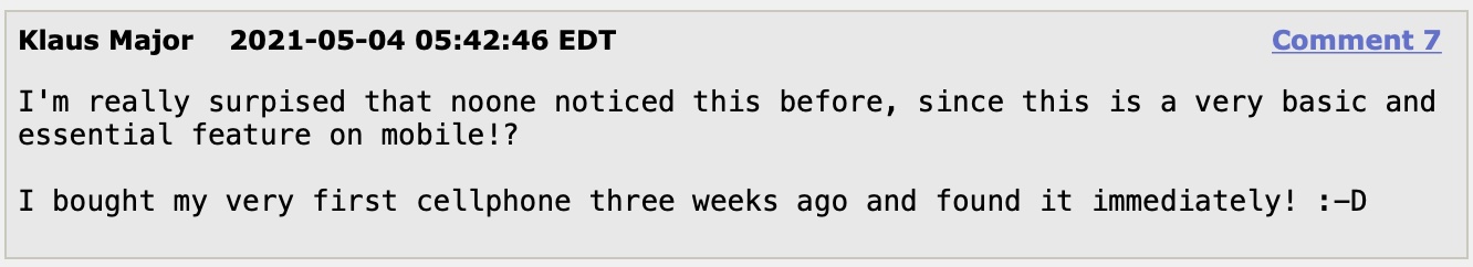 I noticed this in your bug report: I'm more surprised you bought your first mobile cellphone in April 2021!!!!