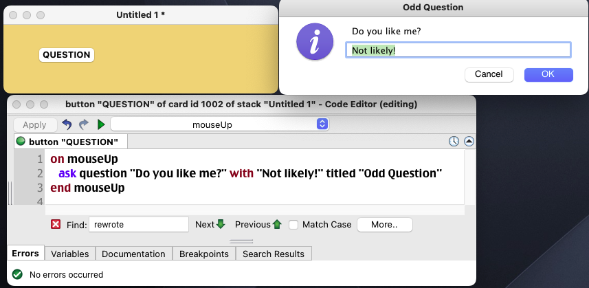 would have made it clear that I made a mistake in my original post, when I indicated, wrongly, that it was with an Answer dialog, when I should have said that it was with an Ask dialog.