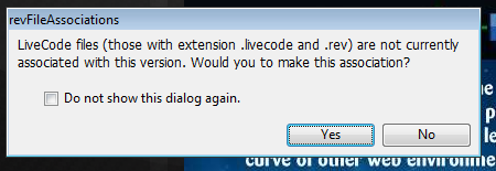 Andy, that suggestion fails for me. I select LiveCode.exe and click Open, but it never appears in the selection of applications to associate with either the .livecode or .rev file extensions.