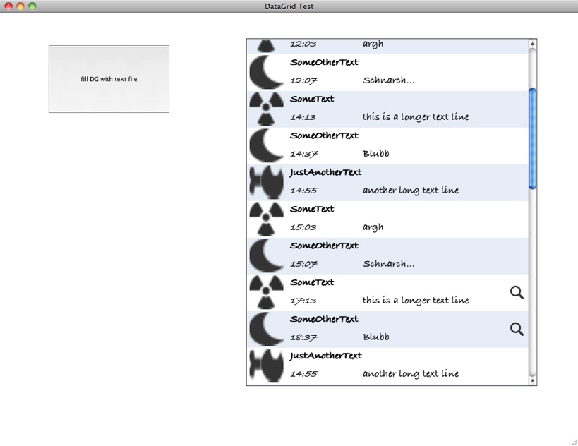 I wrote a little text file with tab separated columns. All the data shows up the right way, but this little object for navigating appears randomly. Yesterday I replaced the field with a button and I skinned the button with an icon. But the behavior is the same. It shows the first appearance of this button in the first line and while scrolling down in the DataGrid it appears again in the first line of the lines which were first outside of the view. When I scroll back a little bit (not all the way up) it appears again on the first viewable line.