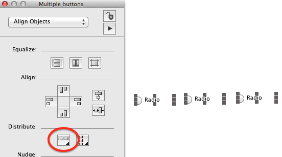 open the Properties Inspector and then select e.g. your radio buttons by shift-clicking or selection-dragging them. Usually the Properties Inspector changes to "Align Objects" . If not select Align Objects from option menuDuring design phase, lets take radio button as an example, I want to have them evenly spaced. I could not find such a feature. Does it exist?