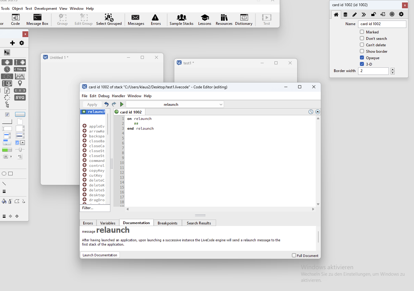 Yes, as I said from the beginning, the relaunch handler only seems to work in a standalone, as the dictionary states. Yes, I am using Windows 11 latest version. Klaus made another observation, but I cannot reproduce. I am uskng .livecodei or .rev as the file extensions.