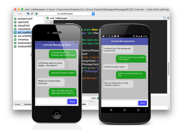 I developed a Messaging demo app for a recent LiveCode workshop I organised with @THINQTANQ (http://forums.livecode.com/viewtopic.ph ... 65#p126665) and am releasing it now as a learning resource (it's definitely not a finished app)