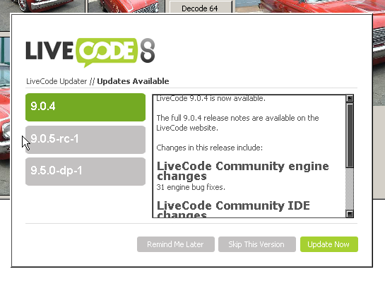 * 9.5.0-dp-1 =RC - Short for "Release Candidate", these releases are feature complete and have been made public to allow LiveCode developers to test whether they think the release is stable. Users who find bugs can file them at https://quality.livecode.com.
