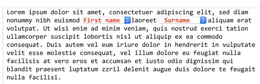 - I need the replacement text to be visible, so when I select "Surname", then that text should show instead of [link]. Thinking of having a backgroundcolor for target text, so text can change but I know it is the variable text