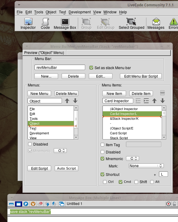 I’m getting a repetitive shoulder/ wrist cramp from going to the Object menu over and over again for Card Inspector….(7.1.1)