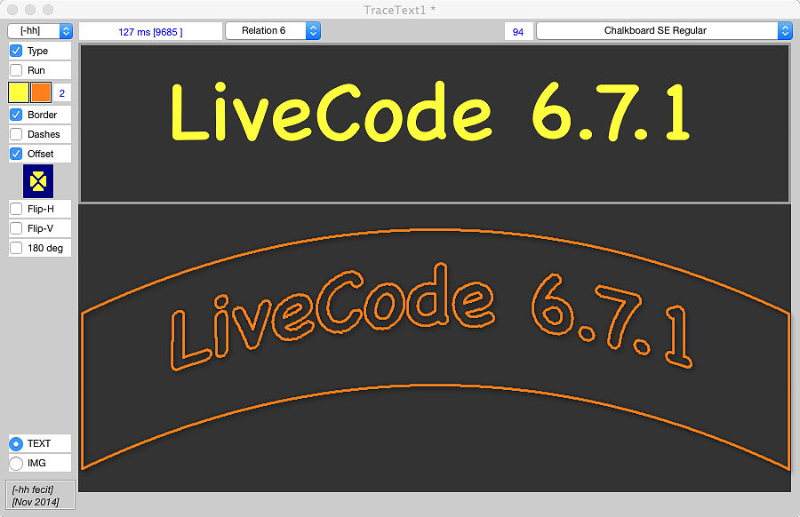 Upper part is a usual field, lower part is a polygon graphic, derived from the field by "tracing" maskdata from a snapshot and then transforming the polygon. Pretty fast with LC 6.7.1, fast enough to be done "live" with every keydown (typing). With LC 7.0.1 it's for rather "static" use only.