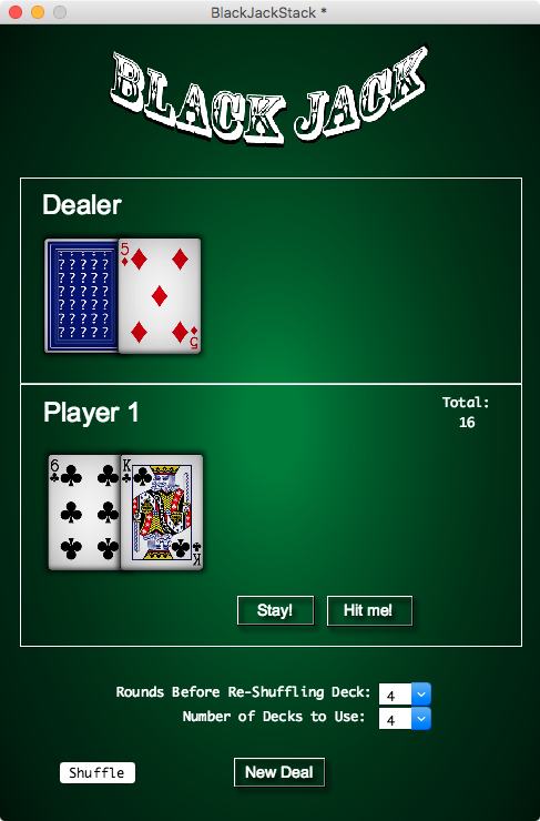 Anyway, make a button and two fields on a new card. Name one field "deck" and the other "hand". Name the button "deal". Make the height of fld "deck" 15 lines.