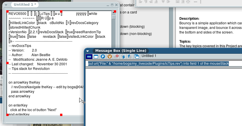 The above is one line. "BK folder" is the folder containing the bundle. "vfTester" is the name of the stack and the stack file.““˘˘ÃÃÄÌVE‘vfTEster ˇˇˇˇ//Applications/Bk Folder/susbrevolution08.bundleU(Text),unicodeUCourier,unicode
