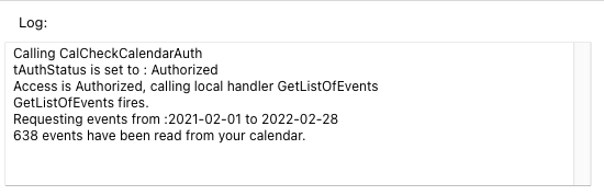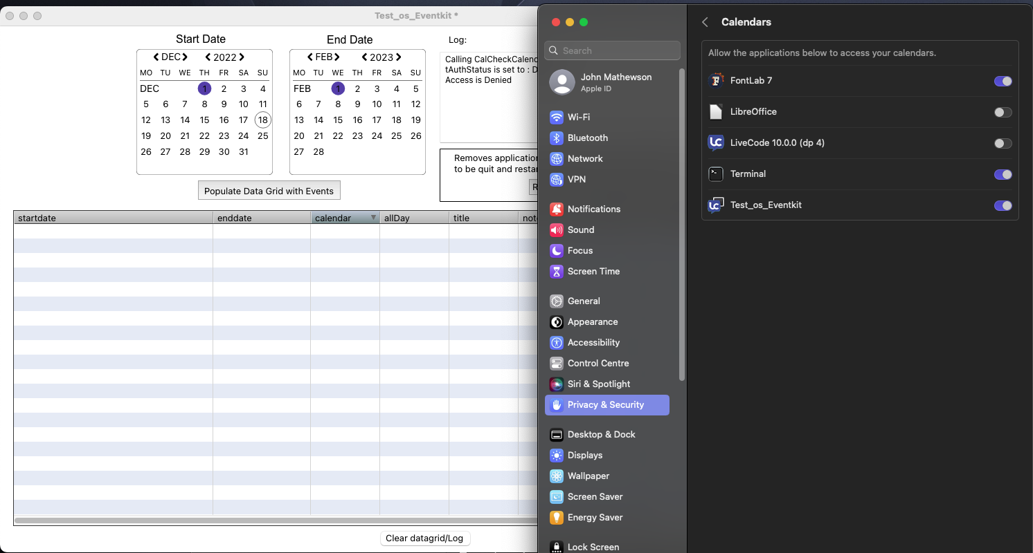 This action should cause MacOS to prompt for permission to access both Calendar and Contacts and then if granted it will return an array of Events data which should populate the datagrid. When complete the application should be listed in your privacy pane. The log panel may give me some idea of what is going wrong should the application fail.