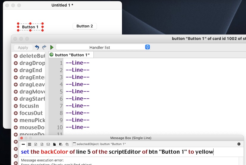 set the backColor of line startline to endLine of fld tField to "255,255,215"I guess I can store the current text portions in a custom property somewhere and reColor every time the SE is in front and I paste something, but does anyone have a better idea? I am a little skittish about lightly hacking the SE in the first place.