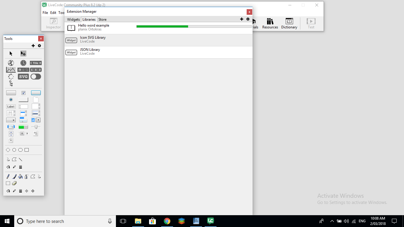 So, I tried the simplest lcb- "hello world". Compiled...OK. Install(from LCB)... Nothing apparent. Shut down and restart LC. No library. Test doesn't work. Used Extension Manager to load the library lce. The attached screenshot shows what happens. Every time. With any and all lce files. Widgets or libraries. The loading hangs.