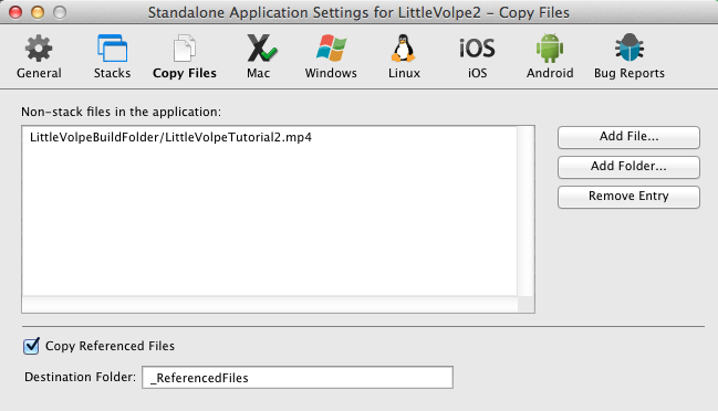 3) The standalone that is produced could not find the movie file. I right-clicked the bundled standalone, drilled down and discovered that my movie file was not in the _referencedFiles folder as was specfied in the standalone preferences (shown below), but ended up in a copy of my build folder "LittleVolpeBuildFolder" as follows: