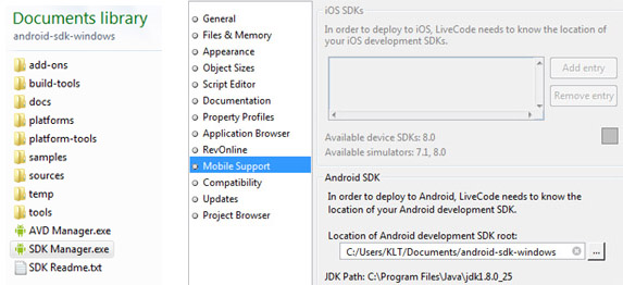 I have nothing Emulator wise downloaded other than what was advised by Neil Roger, Livecode Support Team here http://forums.livecode.com/viewtopic.ph ... 9&start=15 which is 'android-sdkr22-windows' version which is the below image together with my preferences settings and nothing else. What else am I missing for the Emulator Jaque and where do I obtain it?Jaque you wrote: if you haven't downloaded the complete package for the emulator version you are targeting, so make sure all the pieces are there. (You can skip the sample files though, they aren't required.)
