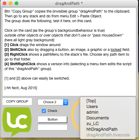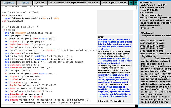 This stack (or it's scripts) can be used especially with "crashed" LC stacks from any LC version, also from LC 7.0 [For experienced users: It is more than looking on a stack file with a text editor, it tries to extract all scripts from the file.]