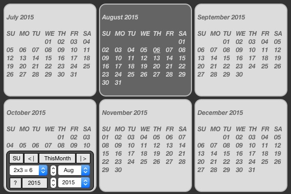 The stack allows to display a one- or three- or 6- or 12-month calendar. The calendar dates are computed by a LC script (no shell() used), so that you have easily full access to the output layout. Here you can choose Sunday or Monday as start of the week.