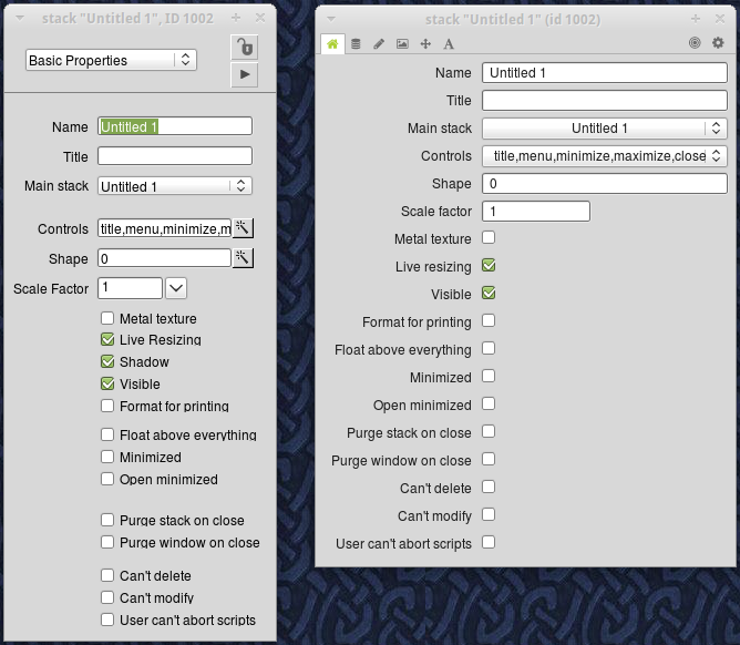 The Property Palettes from LiveCode 7.1 and 8.0 respectively.