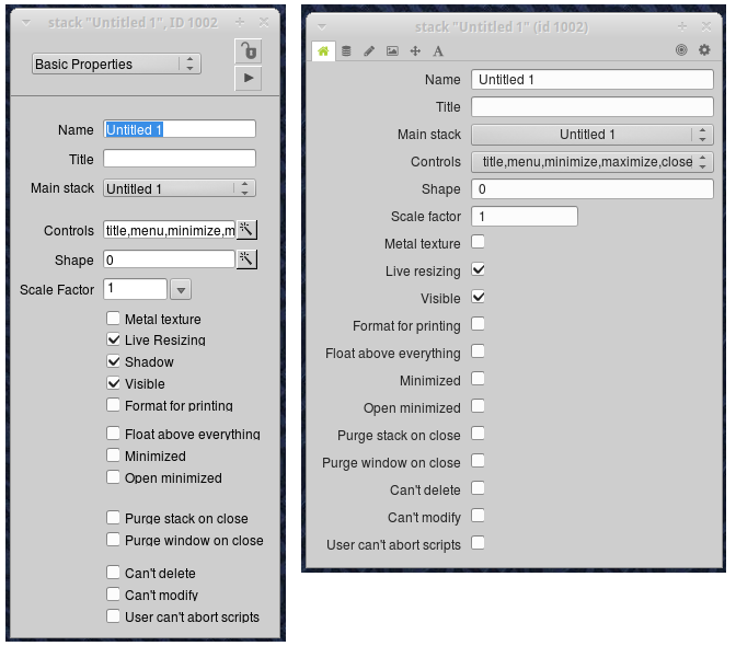 The Property Palettes from LiveCode 7.1 and 8.0 respectively.