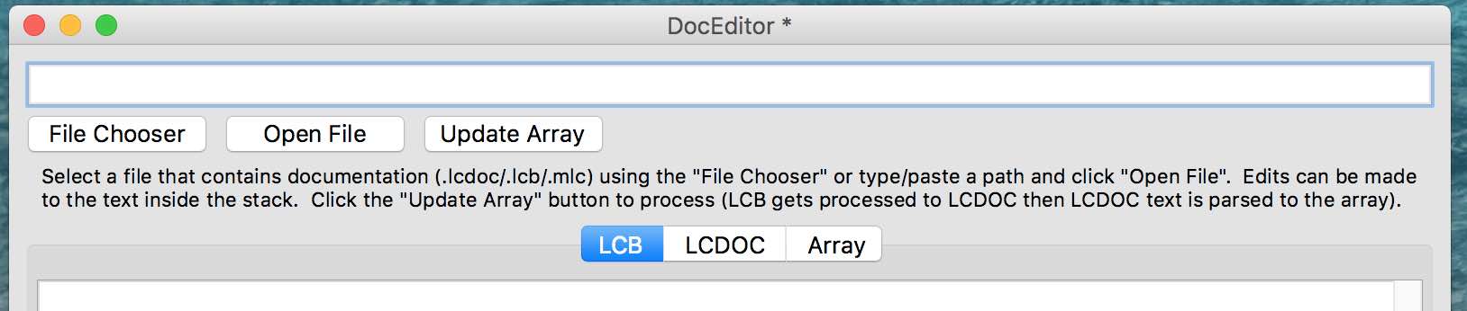 I decided that my original stack needed an update. Here's something that is probably a little more useful. It will import LCB or LCDOC files and parse them into the doc array as before, but you can also edit the source text and reprocess within the stack. This should allow a better feedback loop on how changes are seen by the parser. Also, for LCB files you can easily switch between the original source and the LCDOC that it gets converted to.