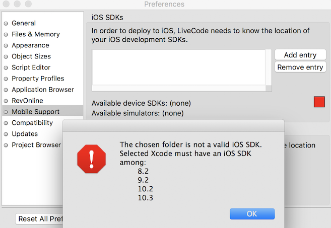 I am not able to set the LiveCode XCode IOS development SDK's folder.
