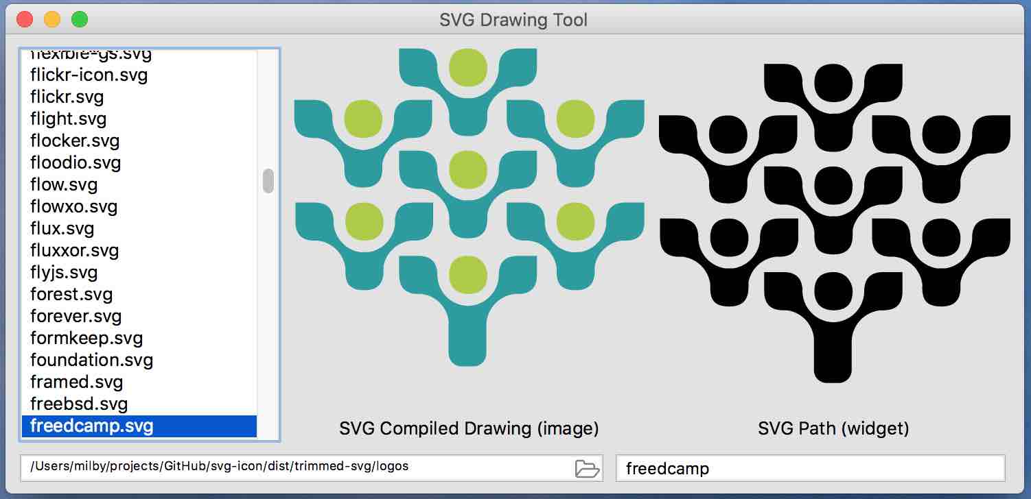 Based on the icon tool, I put this stack together today. It allows you to open a folder of SVG drawings and then compare how they display as just a path (suitable for the icon widget) and as a compiled svg drawing (in an image). For some, the only difference will be colors. Some have a size specified which makes the drawing version not scale. Some do have rendering problems with one or both methods.