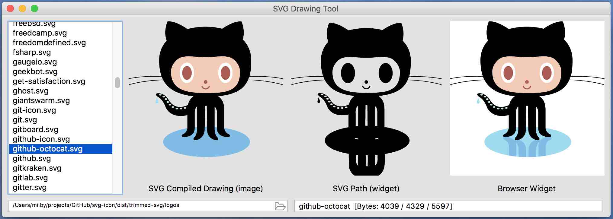 Based on the icon tool, I put this stack together today. It allows you to open a folder of SVG drawings and then compare how they display as just a path (suitable for the icon widget) and as a compiled svg drawing (in an image). For some, the only difference will be colors. Some have a size specified which makes the drawing version not scale. Some do have rendering problems with one or both methods.
