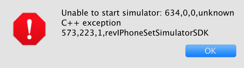 Thanks Tom. I ran into a couple of issues. First, I had a new iPad 5 so I got everything working with that first... works fine (and MUCH faster). Then I started xCode and selected the iPad 11.2 simulator as you suggested and it fired up. However, it does not fit on my MacBook pro screen. I can't see the home button for example. Is there anyway to shrink it to fit the MacBook screen? That aside when I went back to Livecode where I had compiled for iOS 11.2 or later, 64 bit and iPad (the settings required for the real deal) and hit the test button (test target had also been configured for iPad 11.2) I got the following dialog error. Which of course means nothing to me. Someday they'll learn to translate this stuff into human readable form or replace us all with robots