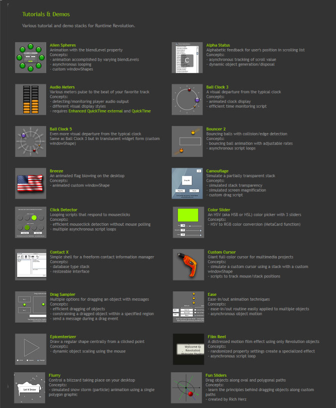 With Scotts new site his demo's and tutorials where not found - I painstakingly downloaded from archive.org and made a graphic and links to post here but Scott has kindly found his old stuff - made sure it works with LC 8 and sent me a link. I think we can all learn something here.