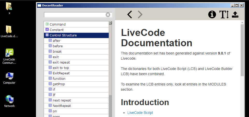 One of my other stacks "Make Docset" produces a Livecode package containing the complete dictionary API as well as all the guides that ship with each version of Livecode. This package can be read by DASH compatible readers that accept user contributed sources.