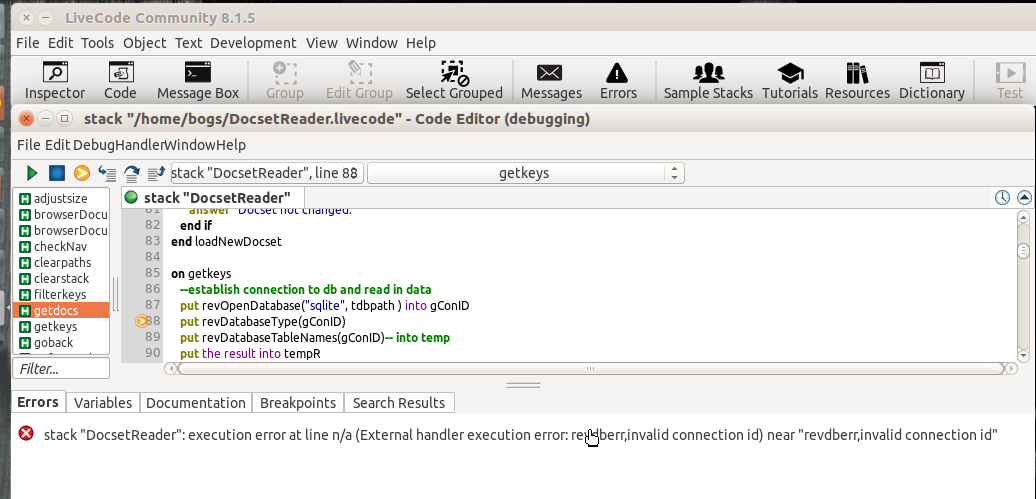 Having failed using that tack, I opened Lc 8.1.2 on the 'nix desktop and opened the reader stack there, since that IDE is *mostly* working on this distro (but still can't save to standalone) thinking I would make sure that it could run on 'nix, so I left the messages enabled. It opened the answer dialog, which I used to navigate to the previously created docset folder, where I chose Info.plist (which seemed like the only choice to make).