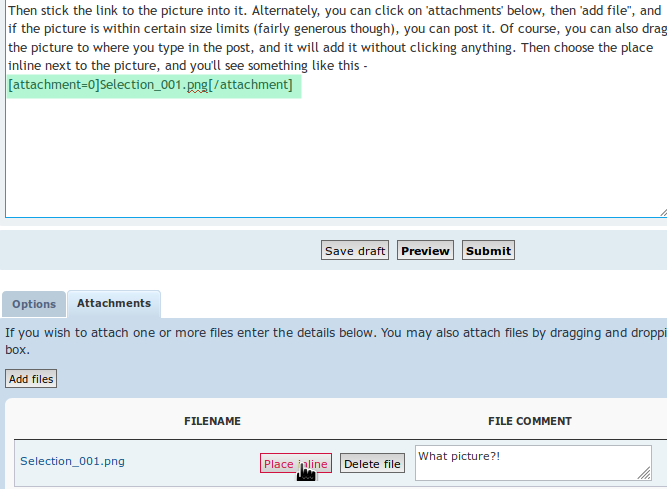 Then stick the link to the picture into it. Alternately, you can click on 'attachments' below, then 'add file", and if the picture is within certain size limits (fairly generous though), you can post it. Of course, you can also drag the picture to where you type in the post, and it will add it without clicking anything. Then choose the place inline next to the picture, and you'll see something like this -