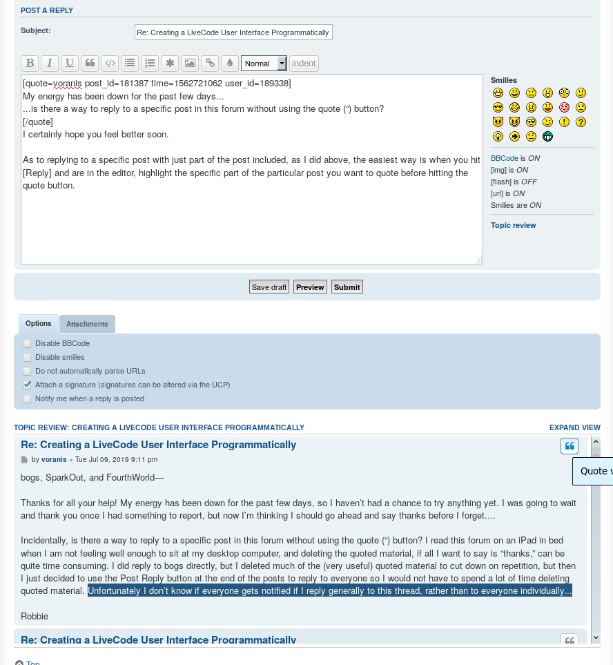 As to replying to a specific post with just part of the post included, as I did above, the easiest way is when you hit [Reply] and are in the editor, highlight the specific part of the particular post you want to quote before hitting the quote button.