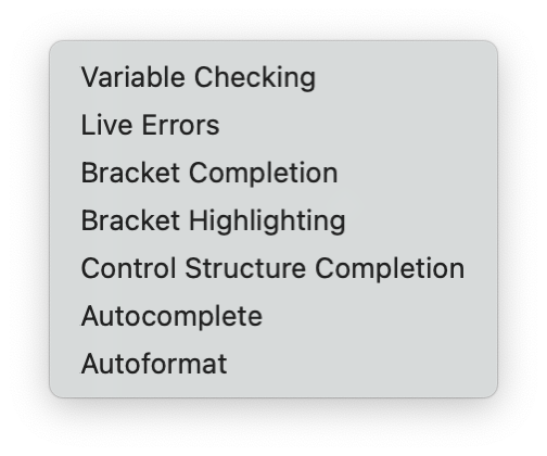 Just the usual suspects under 'options' in the edit menu of the script editor, i.e. live variables, matching brackets, etc.