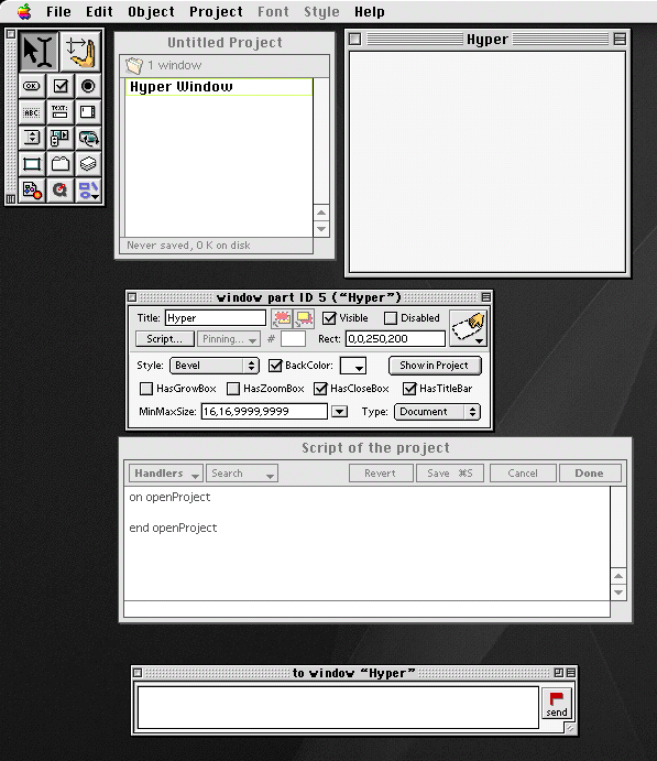 Serf has a Tool Palette and Message Box for fast access to your windows and handlers. Instead of putting up dialog boxes at every turn, you can change options while you work through a sophisticated yet simple Part Information window. This palette is space-efficient and fits in any closet or underneath the bed. A 640x480 screen is sufficient to use Serf; anything larger is nice but not required."