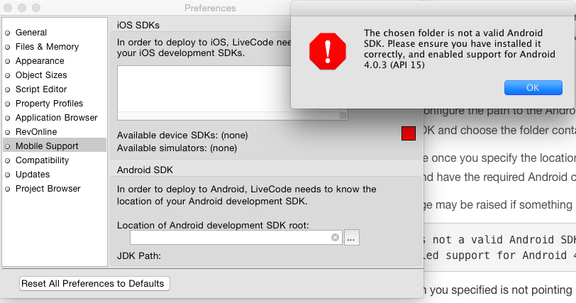 If i try to set the preferences in mobile support and choose the android/sdk path it gives me an error.