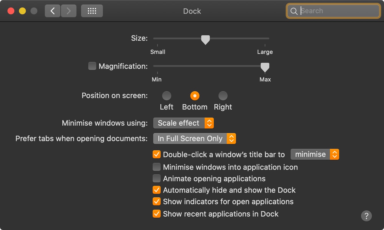 In the middle of the pane is the option "Prefer tabs when opening documents:" with a pop up of options; "Always, in Full Screen Only, "Manually"
