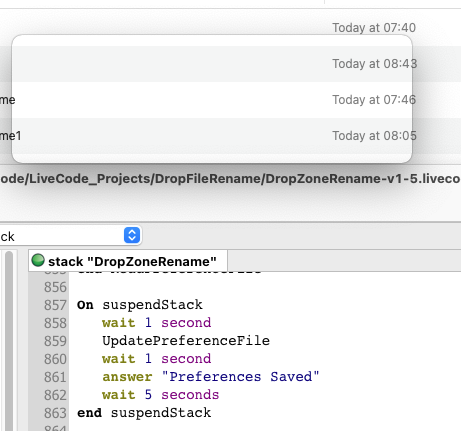I have a utility application (i.e. pretty rough for my own use only!) that saves data to a preference file. The preferences are loaded in a preopenstack handler and this all works.