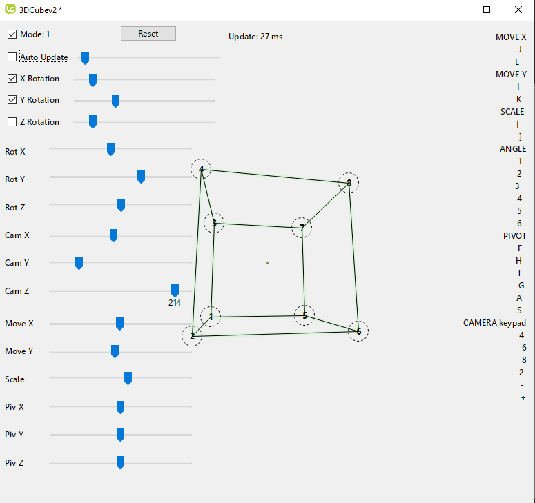 fXrot,fYrot,fZrot modifiy the ANGLEX,ANGLEY,ANGLEZ variables at the top of each run of the loop. The tutorial had some high integer values 5,8,3 and the cube was spinning like crazy every iteration of the handler, these values are floats so we get fine control over our cube rotation. Shift key with X,Y, and/or Z will set these values to zero so you can do things like zooming in and out without the cube spinning constantly.