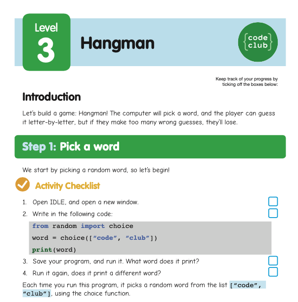 I am going to skip that and move to: Level three: hangman (activity sheet):