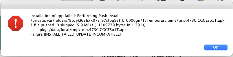 Hi team, I'm getting an error ( INSTALL_FAILED_UPDATE_INCOMPATIBLE) when trying to install from the IDE to a device with Android 6.0. Keeping everything the same but changing to another device with Android 8.1.0 installation goes OK.