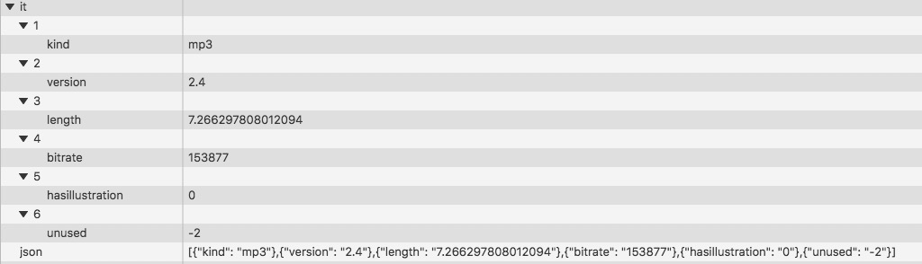 [{"kind": "mp3"},{"version": "2.4"},{"length": "7.266297808012094"},{"bitrate": "153877"},{"hasillustration": "0"},{"unused": "-2"}]