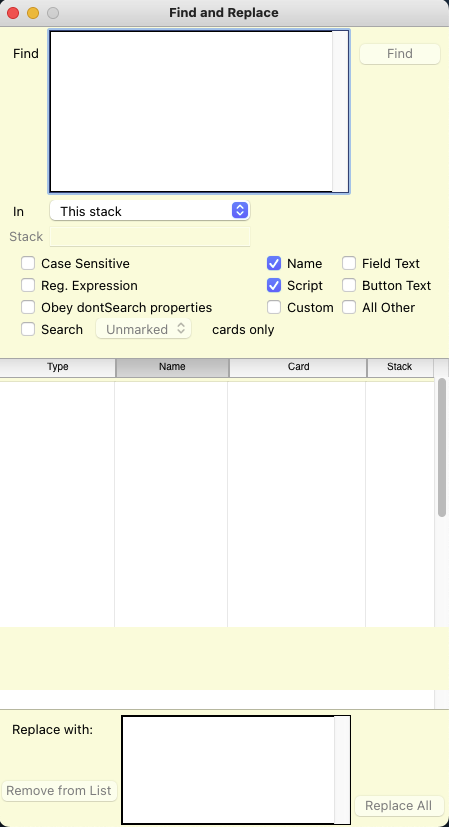 Come to think of things the Find & Replace (revSearch) stack is a very useful tool which those