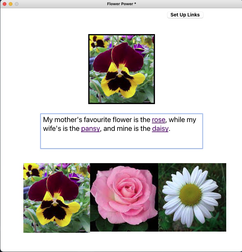 Here is a version which demonstrates the ability for grouped text (where the textStyle is "link") to span over more than one word, and for the linkText to be set to something specific (in this case, the whole image name including .jpeg extension).