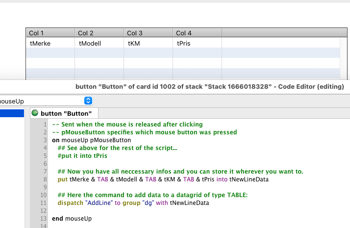 Can we go back to the first step real quick. Add data part, so like. I have the button, I'll click on it and it should ask what model, km, price, etc. How exactly do I ask and put the answers into the grid. It's been a while since I've done any livecode.