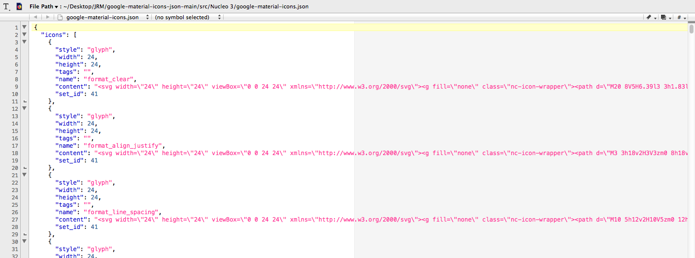 and, looking at a .json file ( https://github.com/NucleoApp/google-material-icons-json ) in a text editor: