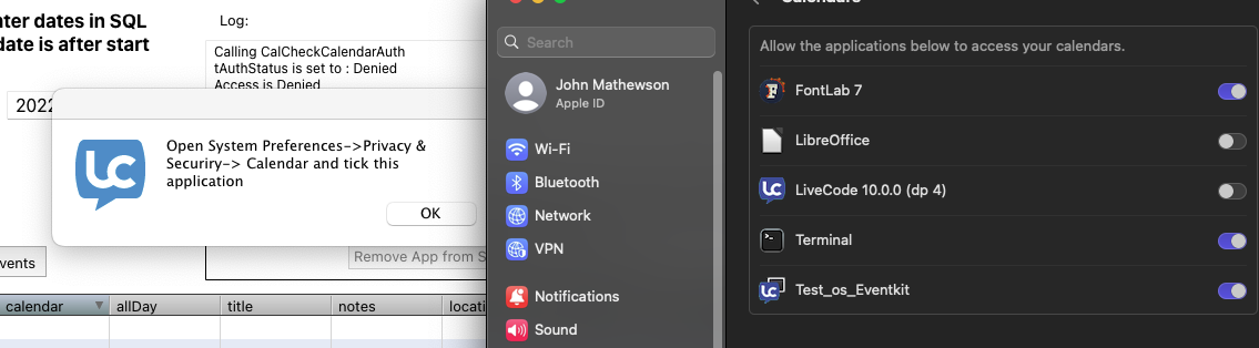 This action should cause MacOS to prompt for permission to access both Calendar and Contacts and then if granted it will return an array of Events data which should populate the datagrid. When complete the application should be listed in your privacy pane. The log panel may give me some idea of what is going wrong should the application fail.