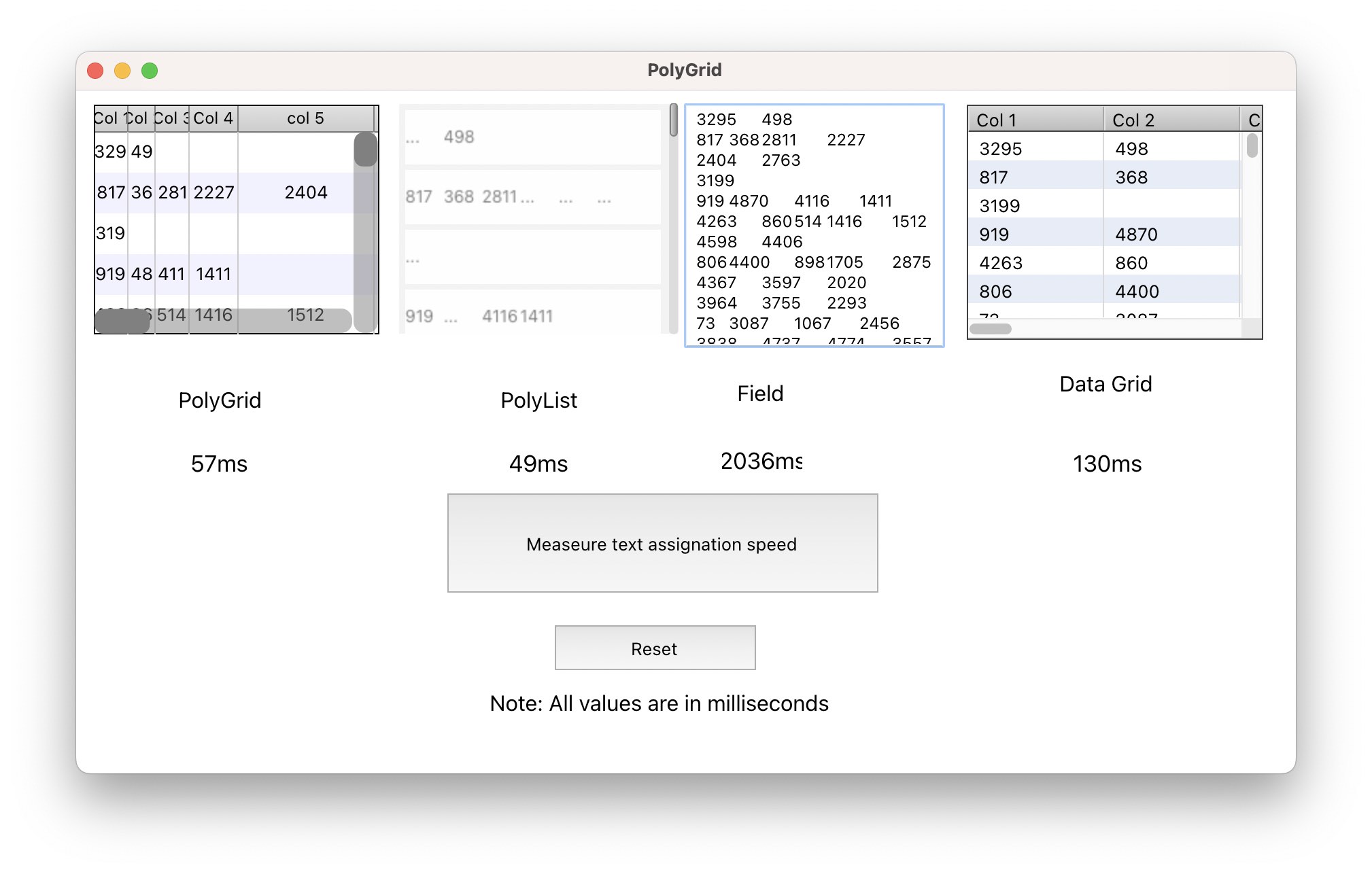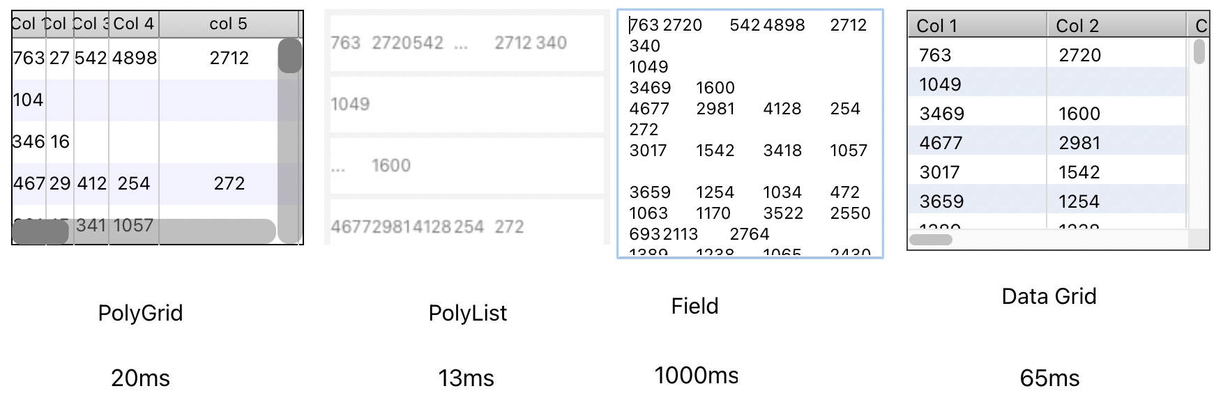 Can you share the test stack?I had make a test of loading random numeric data for 10,000 row and each row is 12 column, then show the data into a field, datagrid, polygrid, polylist, the result as follow :